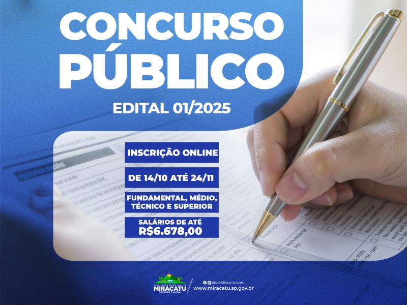 A Prefeitura Municipal de Miracatu divulga o Edital 01/2025 para Concurso Público.